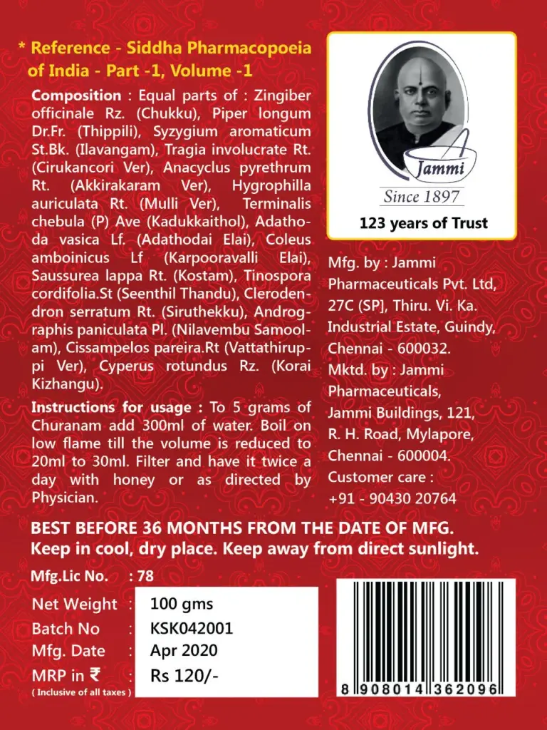 Jammi’s Kabasura Kudineer Chooranam contains all the 15 ingredients as prescribed in classical Siddha textbooks. Uniquely pulverized to enable optimal extraction of active ingredients during kashayam/kadha preparation.