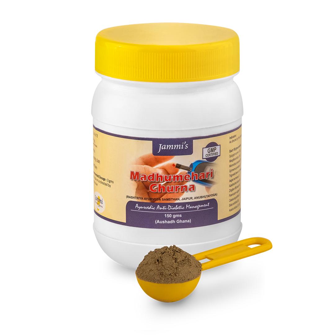 Madhuchari Churna is Jammi's Ayurvedic anti-diabetic herbal powder formulated with classical herbs from traditional Prameha management protocols. Combining anti-diabetic, insulin-sensitizing, and digestive-strengthening botanicals, it supports glucose metabolism, improves pancreatic function, and helps manage blood sugar levels naturally. Best used consistently as a complementary supplement alongside conventional antidiabetic medications under physician supervision with regular glucose monitoring, balanced diet, and consistent physical activity for comprehensive long-term diabetes management support and metabolic balance.