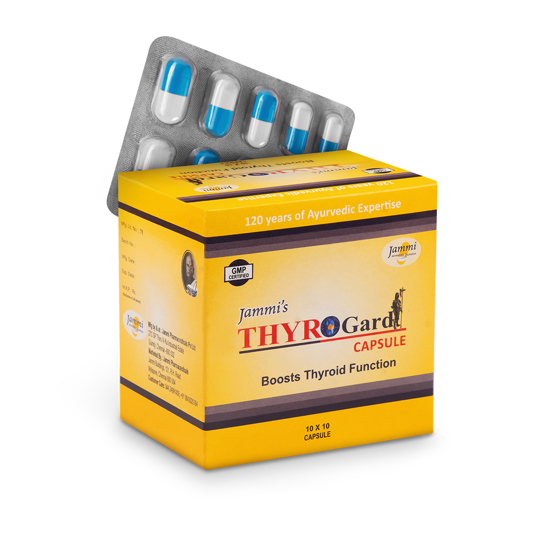 ThyroGard Capsules are Jammi's multi-system Ayurvedic thyroid support formula combining Punarnavadi Mandura, Ashwagandha, Triphala, Yashtimadhu, Yashada Bhasma, and Punarnava. Rather than forcing hormonal changes, ThyroGard gently supports the body's own thyroid regulation — improving T3/T4 balance, boosting metabolic efficiency, reducing fatigue and hair fall, and stabilising hormonal responses. Particularly beneficial for individuals experiencing hypothyroid symptoms, thyroid-related weight gain, chronic fatigue, and adrenal-thyroid imbalance requiring gentle comprehensive Ayurvedic support and management.